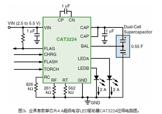 CAT3224則是業(yè)界首款4 A單芯片超級(jí)電容LED驅(qū)動(dòng)器(見圖3),集成了雙模1x/2x電荷泵,提供三項(xiàng)關(guān)鍵功能:精密的超級(jí)電容充電控制、電流放電至LED閃光的管理,以及為L(zhǎng)ED手電筒模式提供恒流。這三種模式的工作電流能以3顆外部電阻作簡(jiǎn)易編程,能吸收達(dá)4 A的LED閃光脈沖電流。超級(jí)電容技術(shù)的高峰值電流優(yōu)勢(shì),結(jié)合CAT3224簡(jiǎn)單的并行邏輯接口,使這器件成為采用LED替代氙氣燈的應(yīng)用的極佳選擇。
