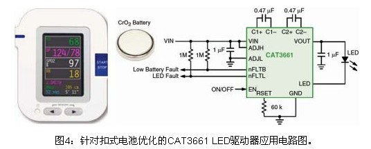 如今,越來越多的創(chuàng)新型便攜設(shè)備采用扣式電池(coin cell)供電,如醫(yī)療應(yīng)用中的血糖儀、數(shù)字體溫計(jì)、血氧計(jì)、呼吸分析儀和生理監(jiān)測(cè)儀等。由于這種電池的獨(dú)特特性以及需要長(zhǎng)工作壽命,這些緊湊型應(yīng)用需要定制的LED驅(qū)動(dòng)器,不僅要管理背光,還要監(jiān)測(cè)電池電量。在這類應(yīng)用中,可以采用安森美半導(dǎo)體計(jì)劃于2010年下半年推出的CAT3661 2至2.5 V單LED驅(qū)動(dòng)器。這器件同樣采用安森美半導(dǎo)體專利的四模(Quad Mode)電荷泵架構(gòu),能效高達(dá)92%,靜態(tài)電流低至約150 μA,提供可調(diào)節(jié)的低電池電量檢測(cè)功能,以及強(qiáng)固的LED故障監(jiān)測(cè)、軟啟動(dòng)和短路限制等保護(hù)功能,采用低高度的3 x 3 mm TQFN-16封裝,非常適合這些便攜設(shè)備應(yīng)用。