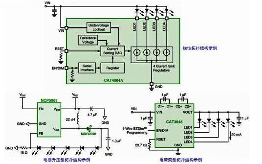 白光LED廣泛用于小型液晶顯示器(LCD)面板及鍵盤背光以及指示器應(yīng)用。高亮度LED則用于手機(jī)和數(shù)碼相機(jī)的閃光光源。這些應(yīng)用需要優(yōu)化的驅(qū)動(dòng)器解決方案,能夠延長(zhǎng)電池使用時(shí)間、減小印制電路板(PCB)面積及高度。在這些應(yīng)用領(lǐng)域,常見的LED驅(qū)動(dòng)器方案涉及線性、電感型或電荷泵型不同拓?fù)浣Y(jié)構(gòu),各有其特點(diǎn)。例如,電感型方案總能效最佳;電荷泵方案由于使用低高度陶瓷電容,占用的電路板面積和高度極小;線性方案非常適合色彩指示器以及簡(jiǎn)單的背光應(yīng)用。安森美半導(dǎo)體提供所有這三種類型拓?fù)浣Y(jié)構(gòu)的LED驅(qū)動(dòng)器方案(參見圖1),滿足用戶不同的應(yīng)用需求。
