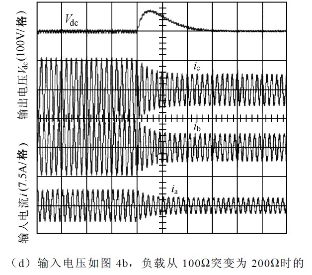 ④從圖4d 可以看出系統(tǒng)動(dòng)態(tài)響應(yīng)時(shí)間約為4 個(gè)電源周期,這和采用文獻(xiàn)[1]算法的系統(tǒng)動(dòng)態(tài)響應(yīng)時(shí)間大致相當(dāng)。對(duì)圖4a 和圖4b 的各電流波形進(jìn)行傅里葉分析,各相的THD 均在3%以下,功率因數(shù)為99.98%左右,進(jìn)一步驗(yàn)證了改進(jìn)控制策略的正確性在輸入對(duì)稱或不對(duì)稱情況下,各相電流都能很好地跟蹤相電壓,實(shí)現(xiàn)了單位功率因數(shù)。
