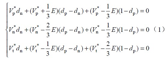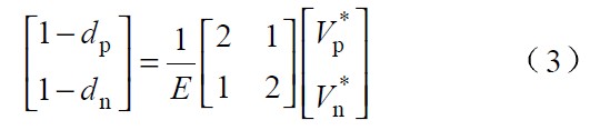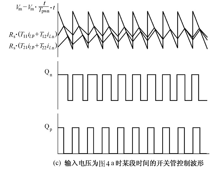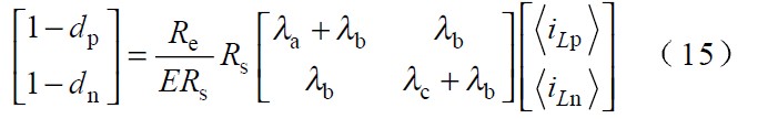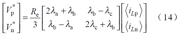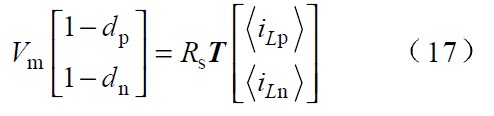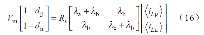 圖中 Vp 、Vn 為不同區(qū)間所對(duì)應(yīng)的電壓,Lp、 Ln 和Lt 為不同區(qū)間所對(duì)應(yīng)的電感,Tp、 Tn 為不同區(qū)間所對(duì)應(yīng)的主控開關(guān),dp 、dn 為主控開關(guān)的占空比。由于PWM 開關(guān)頻率遠(yuǎn)高于電網(wǎng)頻率,因此,在一個(gè)開關(guān)周期內(nèi),各電感的電壓平均值為零,運(yùn)用回路電流法和節(jié)點(diǎn)電壓法對(duì)各種開關(guān)狀態(tài)進(jìn)行分,析可得出:
