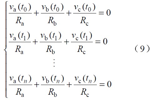三相輸入電壓不對(duì)稱時(shí),假設(shè)各相電流跟蹤各自的相電壓此,時(shí)可令從輸入端看進(jìn)去各相對(duì)中線的等效電阻為Ra ,Rb 和Rc 。因系統(tǒng)采用三相三線制在任意時(shí)刻均有: