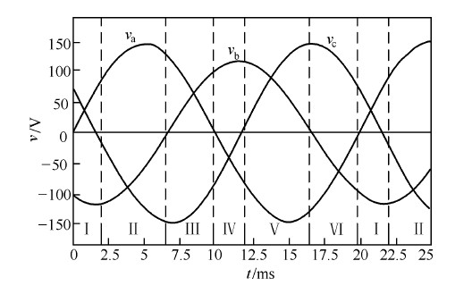 圖 1 給出了雙并聯(lián)升壓型三相整流器的主電路原理圖。另外,圖2 還給出了輸入電壓b 相幅值減少20% ,c 相相位滯后30 °時(shí)三相電壓的波形,并按虛線劃分為六個(gè)區(qū)間。須注意的是,輸入電壓不對(duì)稱的情況不同,其分區(qū)點(diǎn)也可能不同,分區(qū)點(diǎn)由各相非零序電壓瞬時(shí)最大幅度區(qū)分點(diǎn)所確定。依據(jù)六階段PWM 控制技術(shù)原理,三相整流器可以通過在線性周期的每一區(qū)間內(nèi)控制兩個(gè)開關(guān)的通斷來實(shí)現(xiàn)單位功率因數(shù)。
