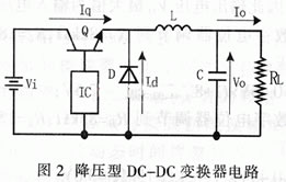 圖2所示為降壓型DC-DC變換器的典型電路,當控制器IC感應到輸出電壓Vo太低時,啟動通道上的晶體管Q給電感器L充電,同時也對電容器C充電,當輸出電壓V0上升到一個預定值時,控制器關閉通道上的晶體管Q,電感器L和電容器C上獲取的能量通過肖特基二極管構成的回路自由釋放,從電感器L到電容器C進行有效的能量傳輸會消耗一部分能量,因此加載在負載上的電壓有所下降。
