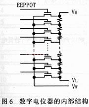 數字電位器的內部結構如圖6所示,它用控制MSO管的開關來調節滑動端VW在VH和VL之間多個等值電阻的位置,抽頭數越多,等值電阻越多。調整的范圍越寬,對DC-DC變換器的輸出電壓調整幅度越小。