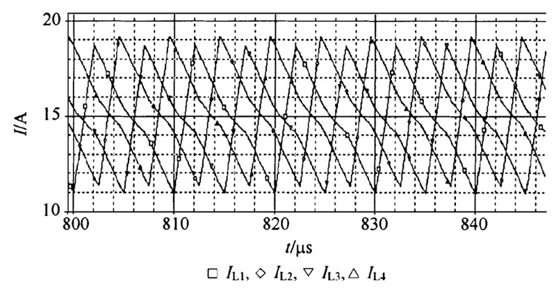 圖6 所示為濾波電感的電流波形, 從圖6 可以看出, 4 個濾波電感的電流輪流充電, 如果一個濾波電感在充電, 其余3 個電感必須在放電, 在死區時間內, 4 個濾波電感都在放電。