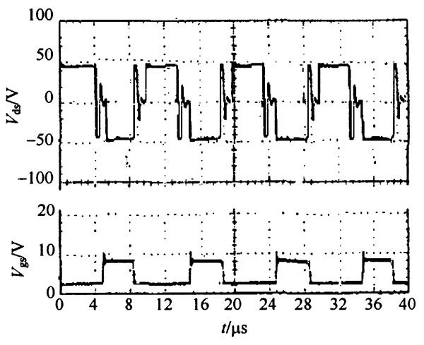 通過理論研究及仿真分析, 可以看出, 交錯并聯的低壓大電流DC - DC 變換器具有良好的性能,在輸出為1125 V/ 60 A 的情況下, 輸出電流紋波可以降到很小。為了進一步說明這種拓撲結構的可行性, 用實驗結果驗證。實驗電路見圖4 , 實驗參數和仿真相同, 最后得到如圖9 所示的實驗波形。圖9 中, V gs為一次側一個MOSFET 的門極驅動電壓波形, V ds則為相應的MOSFET 的柵源電壓波形,從圖9 可以看出, 實驗結果所得波形同圖5 的理論分析結果十分吻合, 所提出的方法是可行的。其中, 變壓器選用R2 KB 軟磁鐵氧體材料制作的GU22 磁心, 原副邊的匝數分別為8 匝和1 匝; 電感選用寬恒導磁材料IJ 50h 制作的環形鐵心T5 - 10 - 215 ,匝數為8 匝。