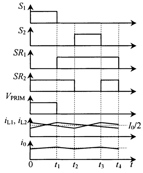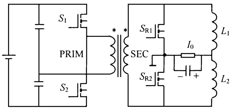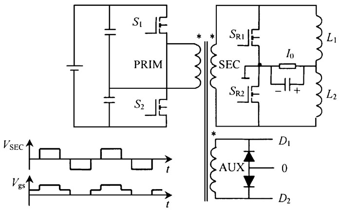首先這種拓撲結構最大的優點是變壓器原邊的結構簡化, 控制變得很簡單。其次, 這種方法的實現必須采用同步整流電路, 因為交錯并聯電路的實現要求變壓器副邊上下電位輪流為正, 在一個時間段內有且只有一個為正電位, 其余都為零電位。但在這種拓撲結構中, 由于2 個變壓器的原邊串聯在一起, 而副邊是并聯的, 這樣如果用肖特基二極管作整流器, 那么輸入電壓將在2 個變壓器原邊上分壓, 而肖特基二極管又沒有選通的功能, 這樣變壓器二次側的波形將是完全對稱的, 上下2 個整流電路的電流完全重合, 達不到電流交錯并聯的目的。