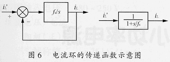 將s=2πfc代入上式,并令上式等于1時,可得環路的剪切頻率fc=fs/(2π)。因此,可將電流環等效為延時時間常數為一個開關周期的純慣性環節,如圖6所示。顯然,當電流誤差放大器的增益GCA小于最優值時,電流響應的延時將會更長。
