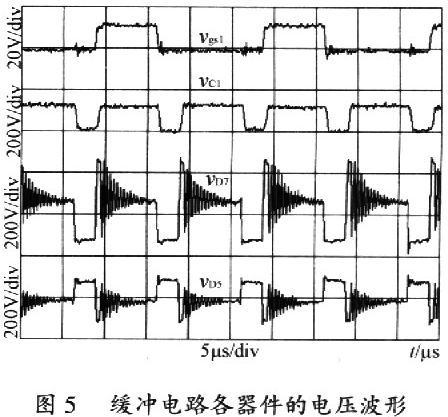 圖5給出了緩沖電路各器件的電壓波形,波形從上往下依次是vgsl、vC1、vD7、vD5。當任何一個開關管開通時,緩沖電容充電,抑制了關斷整流管的電壓尖峰;當任何一個開關管關斷時,緩沖電容給負載釋放能量,然后4個整流二極管均導通續流。整流二極管和緩沖二極管上振蕩周期均為和緩沖電容無關。其中,CD為整流二極管導通時的等效結電容。