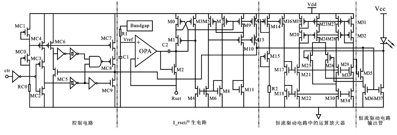 整個控制模塊利用施密特觸發(fā)器實現(xiàn)電平的準(zhǔn)確翻轉(zhuǎn),通過邏輯門作用于MC8、MC9.這兩個MOS管在控制信號發(fā)生翻轉(zhuǎn)時迅速將電平拉高或拉低,實現(xiàn)了對控制信號控制功能的加速作用,電路的響應(yīng)速度快。當(dāng)ctr信號為高時輸出禁止,ctr信號為低時輸出允許,從而實現(xiàn)利用外部的PWM信號實現(xiàn)調(diào)光功能。I_rset產(chǎn)生電路要實現(xiàn)通過外設(shè)電阻Rset對I_rest大小的控制,并且對與固定的Rset可以恒流輸出。利用帶隙電壓源產(chǎn)生一個基準(zhǔn)電壓,利用運(yùn)放實現(xiàn)基準(zhǔn)電壓到基準(zhǔn)電流的轉(zhuǎn)換。將運(yùn)放的反相端連接到外設(shè)電阻Rset就實現(xiàn)了轉(zhuǎn)換的電流大小受控于Rset.通過后續(xù)電路將電流適當(dāng)放大,最終給出I_rset.總體電路利用確立好的恒流驅(qū)動模塊實現(xiàn)恒流輸出。
