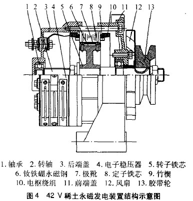 目前稀土永磁材料已經具備了較高的性價比,現代電力電子技術也為研制出斬波式的電子穩壓器奠定了基礎。因此,利用稀土永磁材料和現代電力電子元件研制出結構簡單、發電效率高、壽命長的42V稀土永磁發電機具有較高的研究價值和廣闊的推廣前景。
