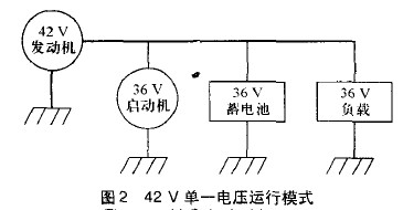 在新的電氣系統中,有兩種實施方案:一種是全車42V單一電壓方案;另一種是42V/14V雙電壓方案。