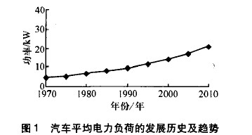 汽車電源的電壓從上世紀50年代的6V改為12V,己有50多年的歷史。自1990年開始,汽車用電量每年以5%~8%的比例增加,其平均電力負荷的發展歷史與趨勢見圖1。隨著汽車技術的不斷進步,將會有越來越多的電氣及電子系統被應用到汽車上。