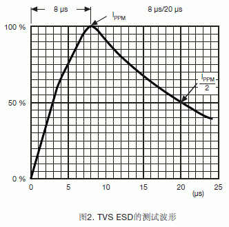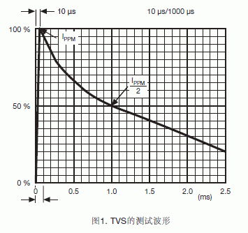 TVS的額定功率是在一定測試或應用條件下吸收浪涌的能力。10μs/1000μs脈沖波形的工業標準測試條件(Bellcore 1089標準)如圖1所示。這個測試條件不同于8μs/20μs脈沖波形的TVS瞬態電壓吸收能力測試條件,如圖2所示。