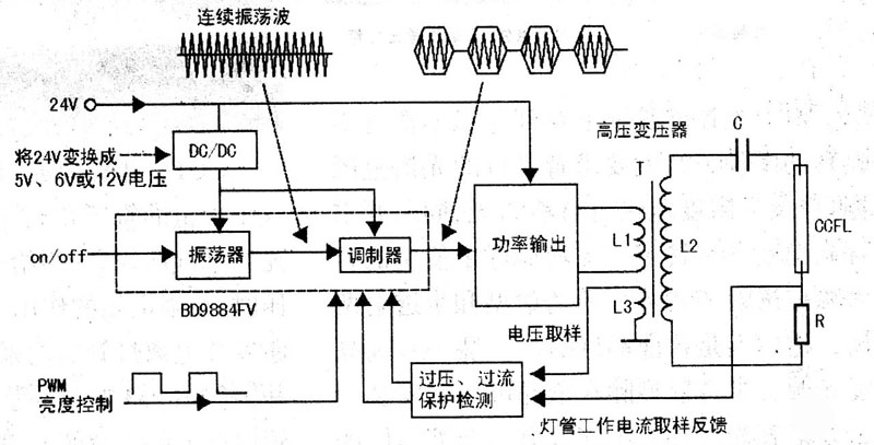 串聯在背光燈管上的取樣電阻R上的壓降作為背光燈管的工作狀態檢測信號,送到保護檢測電路中。L3的輸出電壓作為輸出電壓取樣信號,也送到保護檢測電路中。