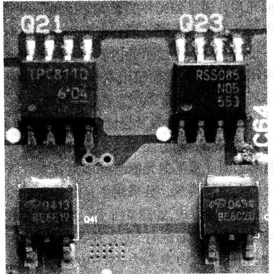 背光燈驅動板主要由振蕩器、調制器、功率輸出電路及保護檢測電路組成,如1圖所示。在實際電路中,除功率輸出部分和檢測保護部分外,振蕩器、調制器及控制部分通常由一塊單片集成電路完成,這類集成電路常用的主要有BD(Rohm公司生產,如BD9884FV、BD9766等)及OZ系列(凹凸微電子公司生產,如02960、02964等);功率輸出管多采用互補的功率型場效應管,有的采用3腳和8腳(①~③腳為S極,④腳為G極,⑤-⑧腳為D極)貼片封裝型,常見型號有D454、RSS085、D413、TPC8110、FDD6635.FDD6637等,如圖2所示;還有的采用由N溝道和P溝道組合的5腳或8腳MOSFET功率塊(①腳為Sl極,②腳為Gl極,③腳為S2極,④腳為G2極,⑤~⑧腳為D1、D2極),如SP8M3、TPC8406、4614、APM40520、P2804ND5G等,如圖3所示。保護檢測多由集成電路10393、358、393或LM324及其外圍元件來完成。輸出電路主要由高壓變壓器、諧振電容及背光燈管組成,并設有輸出電壓、輸出電流取樣電路。