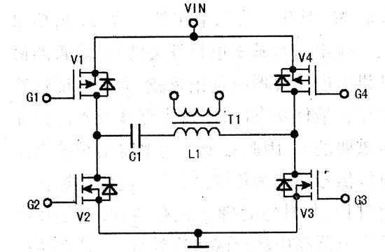在低壓輸入端正弦化處理的功率驅動電路簡圖如圖12所示,Vl、V4為P溝道MOSFET管,V2、V3為N溝道MOSFET管,電容Cl與高壓變壓器Tl的初級繞組Ll串聯。該功率驅動電路的4路激勵脈沖如圖13所示。
