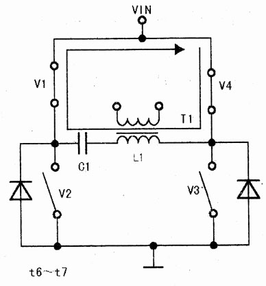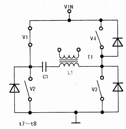在t7~t8期間,V1導通,V2~V4截止,L1中無電流流過,如圖21所示。