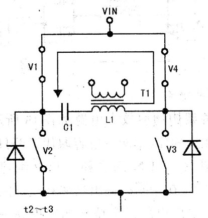 在t2~t3期間,V1、V4導通,V2、V3截止,L1與Cl諧振,Ll中儲存的電能通過Vl、V4給C1充電,流過Ll的電流逐漸減小,其電流回路如圖16所示。