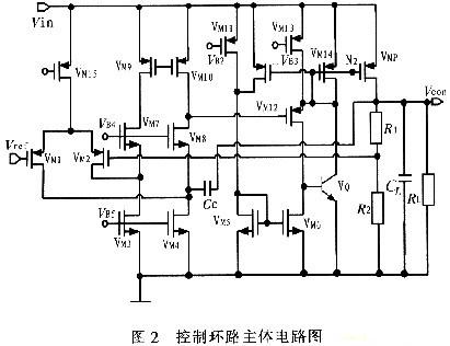閉環(huán)控制系統(tǒng)的主體電路如圖2所示,VM1~VM8組成折疊式的誤差放大器,VM9~VM10組成單級的電流鏡作為負載,這樣做的好處就是采用10 pF左右的補償電容就可以使系統(tǒng)達到穩(wěn)定。VM5~VM14和VQ組成級間緩沖級。R1和R2組成反饋網(wǎng)絡,其中