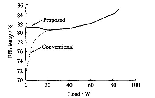 圖14給出了集成了該低功耗電源系統的綠色多模式反激式控制器的效率圖(工作頻率為40~130kHz),并與傳統的反激變換器效率進行了比較。由圖可知,采用多模式反激式控制降低了芯片的輕載功耗,提高了效率。