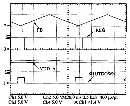 系統的多模式控制測試結果見圖13。中載或重載下系統采用PWM 模式工作,許多單元的供電電源為REG=5 V.極輕載條件下則關斷5 V的供電電源,減小系統的待機功耗,同時也有利于減小EMI和噪聲。其過程如下:當FB電壓低于一個閾值時,待機模式選擇,則SHUTDOWN信號變高,關斷5 V 電壓源REG模塊,同時VDD-AD繼續(xù)給芯片供電,保證在輕載時芯片的檢測能夠連續(xù)實現。