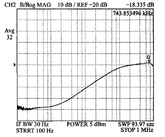 5 V 電壓的PSR測試波形如圖10所示。由此圖可見,其PSR可以達到-60 dB.該供電模塊在工作頻率為40~130 kHz的綠色多模式反激式控制器中的應用表明,它對來自電源的干擾具有較好的抑制能力。