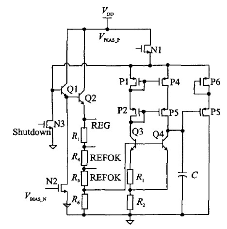 圖5為5 V穩(wěn)定電壓源(REG)的電路原理。其中P1、P2、P3、P4組成共源共柵結構,可以提高電流鏡的鏡像精度,同時提高電源抑制比。Q3、Q4、R 1、R2組成一個帶隙基準電壓,這樣可以減小額外的電流支路,降低功耗。Q1、Q2組成達林頓結構,增加輸出能力。P5、P6增加匹配,減小溝道長度調制效應。Q1、Q2、R3、R4、R5、R6、Q4、P5、P6組成一個負反饋環(huán)路,將REG電壓穩(wěn)定在5 V。圖中C具有兩種作用:1、記憶直流工作點;2、補償環(huán)路電容。