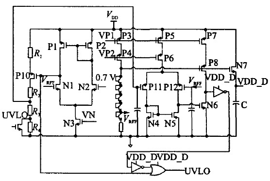 電路的工作原理可簡述如下:12 V供電電壓可在VDD比較低時建立一個PTAT (ProportiONal toabsolute temperature)電流源,然后利用其建立起帶隙基準電壓源;當VDD由0上升時,帶隙基準電壓r首先建立,此時兩個比較器的輸出為低電位,P1導通,輸出為高電位;當K1VDD大于 r時,COMP1輸出跳變,N1管導通,鎖存器鎖存上一個信號,UVLO為高電位(注意其為低電位有效);當K2VDD大于VREF 時,N2導通,則UVLO-out為低電位,使能其他模塊;隨著VDD減小,K2VDD首先小于VREF,N2關斷,則鎖存器鎖存信號,UVLO-out保持;當 VDD減小到K1 VDD小于VREF時COMP1跳變,P1導通,N1關斷,則輸出UVLO-out為高電位,關斷整個控制芯片。