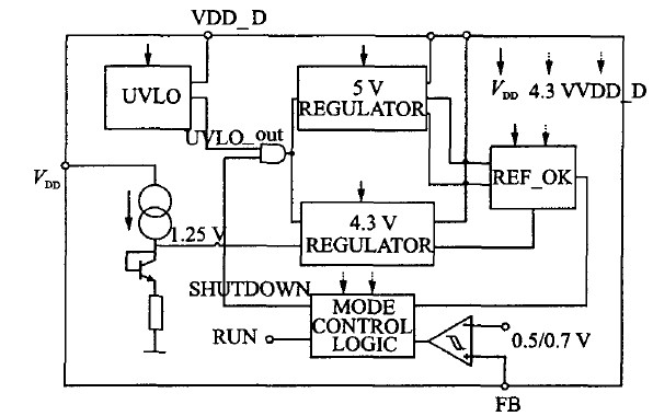 4.3 V 的穩(wěn)定電壓源(VDD-AD)用來在輕載時為系統供電,始終保持工作,在BURST模式下由它為模擬模塊供電。
