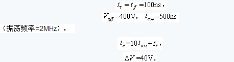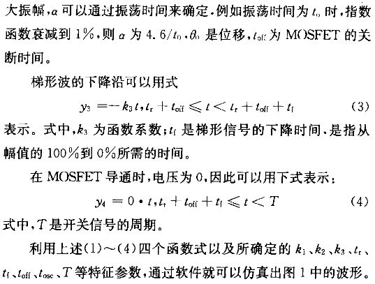 圖1中展示了一MOSFET的漏源極電壓波形,為了研究其上升時間、下降時間、阻尼振蕩等對其頻譜的影響,需要確定該波形的特征參數(shù),然后運用Matlab編程仿真。由于該波形是由一個梯形信號和一個阻尼振蕩信號疊加而成,因此可以用分段函數(shù)進(jìn)行模擬。上升沿可以用式(1)表示。