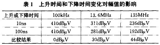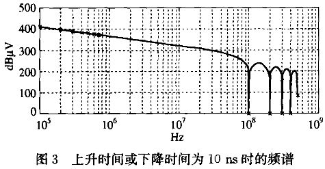 開關(guān)信號的上升和下降沿對干擾的幅值影響很大,圖3是上升時間或下降時間為10ns時的上升沿或下降沿的頻譜,把上升時間或下降時間改為100ns再仿真時發(fā)現(xiàn):當(dāng)上升時間或下降時間增加時,隨著頻率的升高,幅值減小的越快,也就是說,上升或下降時間的變化對高頻干擾幅值影響更大。表1中列出了上升時間或下降時間為10ns和100ns時,不同頻率的電磁干擾幅值和比較結(jié)果。從圖中還可以看出在頻率為