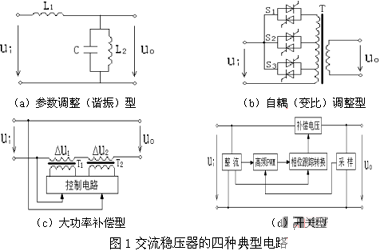 由于我國交流電網(wǎng)的電壓波動(dòng)較大,特別是邊遠(yuǎn)農(nóng)村地區(qū),交流穩(wěn)壓電源已成為許多電子設(shè)備不可缺少的供電裝置[1]。按照工作原理,交流穩(wěn)壓電源可分為參 數(shù)調(diào)整(諧振)型[2]、自耦(變比)調(diào)整型[3]、大功率補(bǔ)償型[4、5]和開關(guān)型[6、7]等四種類型,其典型電路如圖1所示。