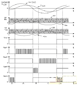 新穎的Buck-Boost型正弦交流穩(wěn)壓器,采用具有輸入電壓極性和工作模式選擇的電壓瞬時(shí)值反饋控制方案,其感性負(fù)載時(shí)的原理波形如圖3所示。圖中 iL21為高頻儲(chǔ)能式變壓器的副邊電感電流iL2的基波分量。通過調(diào)節(jié)PWM信號的占空比,即可實(shí)現(xiàn)正弦交流穩(wěn)壓器輸出電壓的穩(wěn)定。輸出濾波電容與負(fù)載的 并聯(lián)阻抗等效為感性、容性、阻性時(shí),正弦交流穩(wěn)壓器的工作模式順序分別為A-B-C-D、D-C-B-A、A-C。