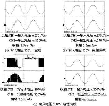 不同輸入電壓和負(fù)載時(shí),500VA 220V±10%50Hz/220V50Hz Buck-Boost型正弦交流穩(wěn)壓器的原理試驗(yàn)波形,如圖4所示。原理試驗(yàn)結(jié)果表明:Buck-Boost型正弦交流穩(wěn)壓器工作時(shí)存在四種DCM模式 A、B、C、D;輸出電壓波形THD含量低;負(fù)載適應(yīng)能力強(qiáng);穩(wěn)壓性能好。試驗(yàn)結(jié)果與理論分析一致。