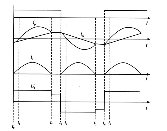 在下半個周期中, 電路的工作與上半個周期剛剛相似,只是方向相反。整個周期的電路工作波形:在上半個周期中,開關管Q1 為零電壓導通, 而Q1 在t3 時刻的關斷電流im 很小; 在下半個周期中,開關管Q2 為零電壓導通,而Q2 在t6 時刻的關斷電流im 很小,所以Q1 、Q2 工作時的開關損耗很小。