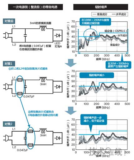 抑制輻射噪聲的最佳元件配置因LED燈泡而異。在其他LED燈泡中,盡管采取了獲得出色結果的圖11的②那樣的配置,即在X電容內側配置片式鐵氧體磁珠,但并未獲得同樣出色的效果。所以又將片式鐵氧體磁珠安裝到X電容外側,此時,輻射噪聲降到了規定值以下(圖12)。也就是說,對于每一個LED燈泡而言,即便使用相同的噪聲對策元件,其效果也是不同的。