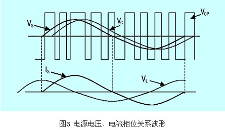 功率因數控制到1.0實際上就是設法使電源電流is與電壓vs同相位。因此,只要讓調制正弦參考波落后電網電壓vs一個角度,整流器網側輸出的PWM電壓vcp的基波分量vc落后于vs,使電流is與電壓vs同相,整流器工作在整流狀態,而且功率因數控制在1.0,如圖3所示。