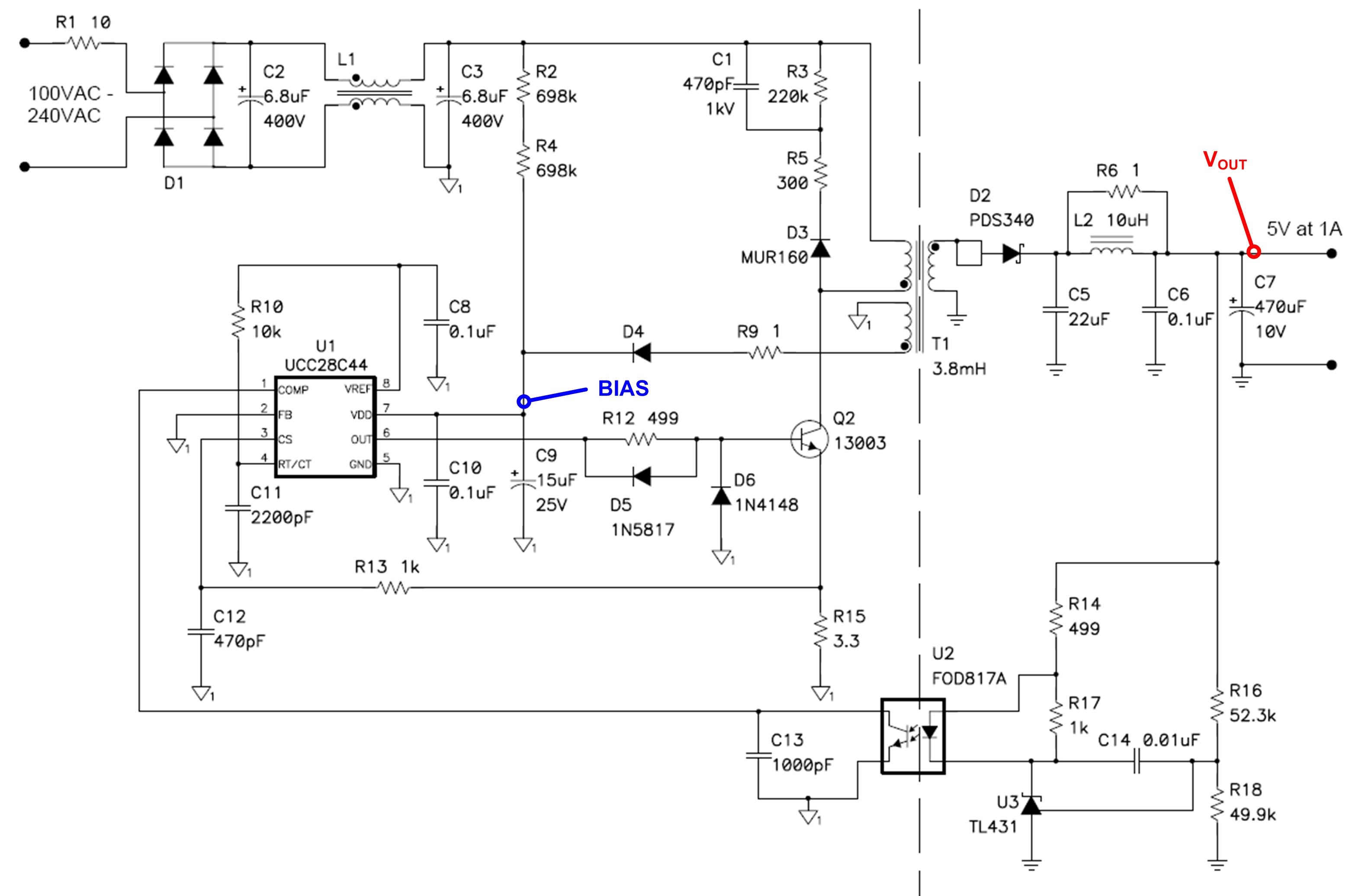 圖 2 這種5V/5W反向通過限制峰值變壓器電流實現功率限制。