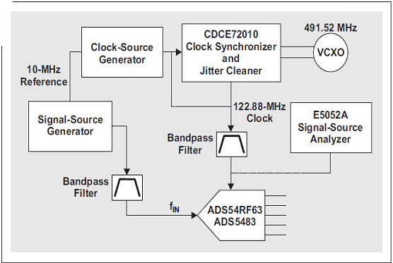 我們做了一個(gè)試驗(yàn),目的是檢查測(cè)得時(shí)鐘相位噪聲與提取自 ADC 測(cè)得 SNR 的時(shí)鐘抖動(dòng)的匹配程度。如圖 11 所示,一個(gè)使用 Toyocom 491.52-MHz VCXO 的 TI CDCE72010 用于產(chǎn)生 122.88-MHz 采樣時(shí)鐘,同時(shí)我們利用 Agilent 的 E5052A 來(lái)對(duì)濾波相位噪聲輸出進(jìn)行測(cè)量。利用一個(gè) SNR 主要受限于采樣時(shí)鐘抖動(dòng)的輸入頻率對(duì)兩種不同的 TI 數(shù)據(jù)轉(zhuǎn)換器(ADS54RF63 和 ADS5483)進(jìn)行評(píng)估。快速傅里葉變換 (FFT) 的大小為 131000 點(diǎn)。