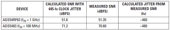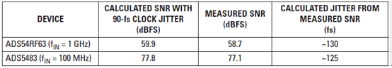 利用調(diào)節(jié)后的相位噪聲曲線圖,計(jì)算得抖動(dòng)較好地匹配了 SNR 測(cè)量結(jié)果,其在 ADS54RF63 和 ADS5483 的 10 到 30 fs 范圍內(nèi)(參見(jiàn)表 8)。考慮到在第三諧波周?chē)赡艽嬖谙辔辉肼暤妮^小時(shí)鐘抖動(dòng)影響,該計(jì)算得 SNR 只是一種非常接近的估算結(jié)果。