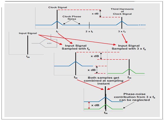 在采樣時(shí)間,基頻正弦波及高階諧波與輸入信號(hào)混頻,如圖 16 所示。(為了簡(jiǎn)單起見(jiàn),僅顯示了一個(gè)諧波。)因此,三階諧波周?chē)南辔辉肼暸c輸入信號(hào)混頻,而第三諧波也形成一個(gè)混頻結(jié)果。但是,由于時(shí)鐘信號(hào)的第三諧波的振幅更低,因此該混頻結(jié)果的振幅也被降低。