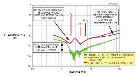電源濾波器中的其它元件是旁路電容。選擇這些電容值時,應使它們的諧振頻率(產生一個接地的低阻抗路徑)接近于開關頻率。這樣,通過磁環的開關噪聲就被短路到地。圖2的電源濾波器插入損耗比較表明,正確的旁路電容值可產生一個接近于開關頻率的諧振,即使是用于一只傳統鐵氧體磁環,如EXCML32A680.不過,在低頻時,如果將其與一只0Ω電阻放在一起,就沒有那么大差異了。另一方面,Murata EMI濾波器提供了圍繞開關頻率的大約20dB額外衰減。圖3中的電源濾波器使用了一只33μF鉭電容做寬頻去耦,而10μF、2.2μF和 0.1μF的陶瓷電容則有狹窄的諧振頻率。