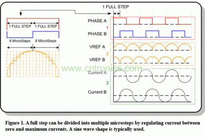 現在,很容易計算出我們馬達的微步進級別。將全步電流強度分成八個更小的電流量級后,馬達繞組受制于八個微步進度。換句話說,我們將1.8度除以8—因此每個微步現在便為0.225度。圖1顯示了通過在零和最大電流設置之間產生多個電流電平(典型正弦波波形后面),將一個全步分成八個微步的過程。