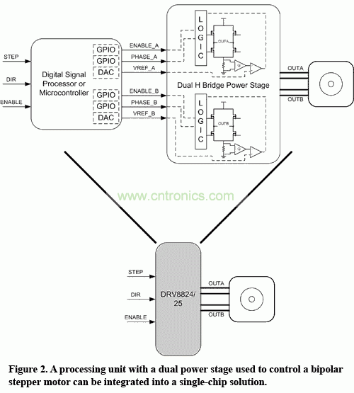 圖 2 具有雙極步進馬達控制用雙功率級的一個處理單元,可以集成到一個單片解決方案中。