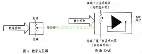 利用數字輸入控制微調模擬輸出有兩種選擇:數字電位器和數/模轉換器(DAC),兩者均采用數字輸入控制模擬輸出。通過數字電位器可以調整模擬電壓;通過DAC既可以調整電流,也可以調整電壓。電位器有三個模擬連接端:高端、抽頭端(或模擬輸出)和低端(見圖1a)。DAC具有隊應的三個端點:高端對應于正基準電壓,抽頭端對應于DAC輸出,低端則可能對應于接地端或負基準電壓端(見圖1b)。