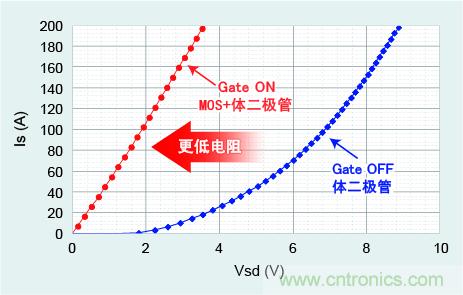 一般Si-IGBT元件無(wú)法逆向?qū)ǎ鳶iC-MOSFET可通過(guò)體二極管實(shí)現(xiàn)常時(shí)逆向?qū)āA硗猓ㄟ^(guò)輸入柵極信號(hào),還可實(shí)現(xiàn)MOSFET的逆向?qū)ǎc二極管相比,可實(shí)現(xiàn)更低電阻。通過(guò)這些逆向?qū)ㄌ匦裕c二極管整流方式相比,可在1000V以上的范圍采用高效同步整流方式的技術(shù)。