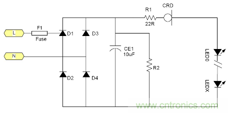 由于恒流二極管需要一定的電壓Vk才能夠進入恒流, 所以太低的電源電壓是無法工作的。通常這個Vk大約在5-10V左右 所以大多數采用電池供電的LED是無法工作的, 最大電流由于恒流二極管的功耗受到限制, 所以過大的電流也是不合適的。例如1W的LED通常需要350mA, 恒流二極管就很難提供, 目前比較合適的使用場合就是交流市電供電的LED燈具采用很多小功率LED串聯也就是高壓小電流的情況是最為合適;但是由于恒流二極管的耐壓有一定的限制 所以它所能吸收的電源電壓變化也是有限的。就拿100V耐壓的CRD來說用在220V市電電源里都還只能對付有限的電壓變化。220V經過橋式整流以后它的輸出直流電壓大約為264V.如果市電變化+10%  ~-15%就相當于整流后為290~187V, 電壓變化103V.已經超過其耐壓了。因為LED伏安特性的非線性 所以很難用公式來表示。總之當市電電壓降低時LED中的電流就會隨市電電壓的降低而降低。其亮度也會跟著變。 典型應用電路中圖3為典型的應用電路, 圖4為加了阻容降壓的應用電路為了應對低電壓的輸出場合。