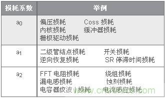 表1概括總結(jié)了各種電源損耗項及其相關(guān)損耗系數(shù),該表提供了一些最佳化電源效率方面的折中方法。例如,功率MOSFET導(dǎo)通電阻的選擇會影響其柵極驅(qū)動要求及Coss損耗和潛在的緩沖器損耗。低導(dǎo)通電阻意味著,柵極驅(qū)動、Coss 和緩沖器損耗逆向增加。因此,您可通過選擇MOSFET來控制a0和a2。